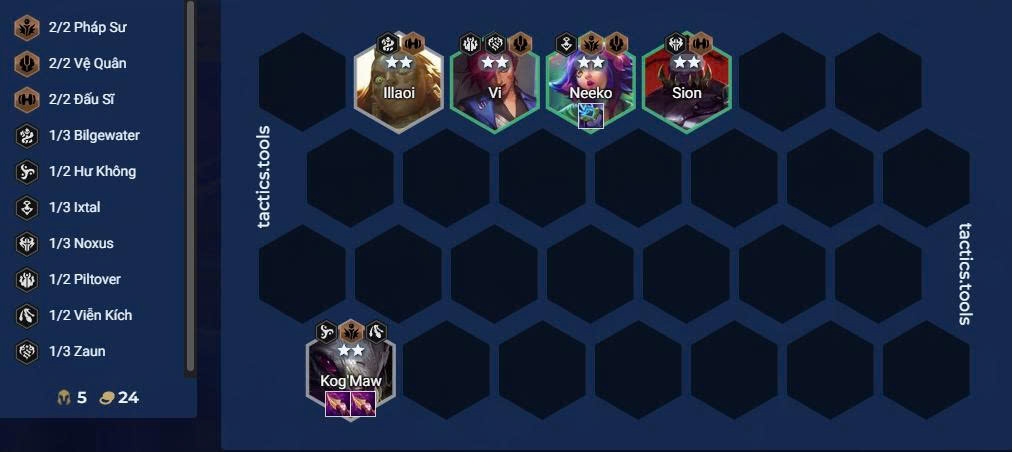 - Tập trung farm vàng nhanh, ưu tiên các tướng rẻ như Neeko, Vi để kích hoạt Vệ Quân sớm, giữ máu trên 70.