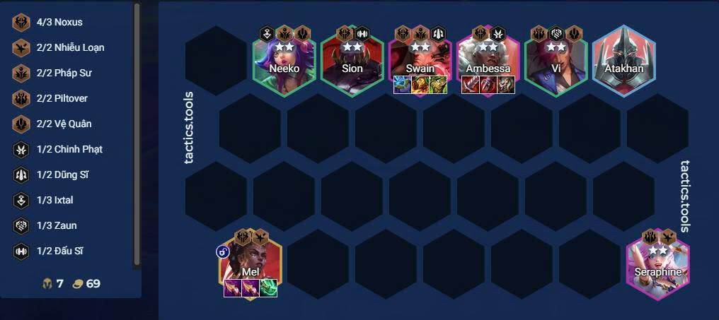 Đây là nền tảng cốt lõi giúp đội hình Mel hoạt động hiệu quả nhất. Neeko và Vi đảm nhận vai trò đỡ đòn, còn Seraphine giúp tăng tốc độ đánh và hiệu ứng kỹ năng.