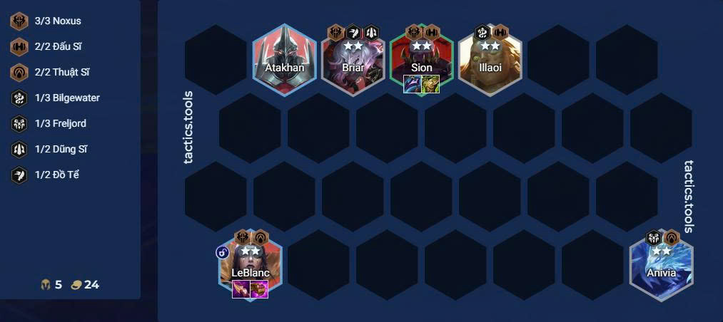 Đến giữa game cấp 6 – 7, bắt đầu dựng khung Noxus tạm thời để giữ nhịp, chuẩn bị dần cho giai đoạn roll tìm tướng đắt tiền ở cấp 8.