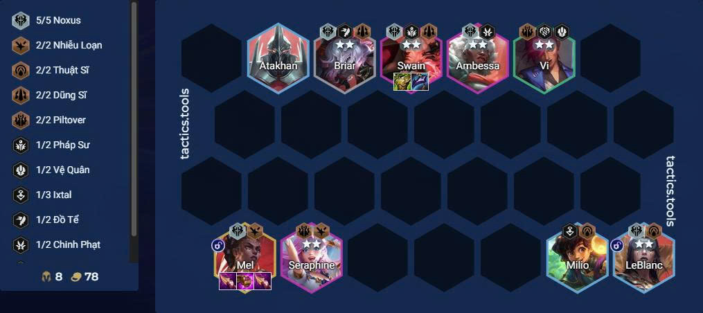 Khung đội hình lúc này có thể gồm: Mel – Ambessa – Sion – Kobuko – Seraphine – Swain – LeBlanc – Vi.