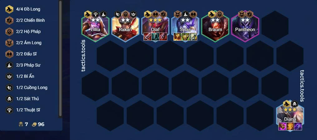 Lối chơi reroll đơn giản nhưng hiệu quả này không chỉ giúp bạn khắc chế meta Thần Long, mà còn mang đến những pha combat mãn nhãn với nguồn sát thương đa dạng đến từ Olaf, Diana và Nilah.
