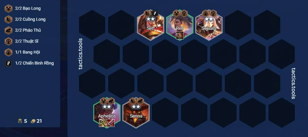 - Các tướng cơ bản đầu trận thường là Rell (Kỵ Sĩ Bạo Long), Sett (Cuồng Long), Aphelios (Pháo Thủ Bạo Long).