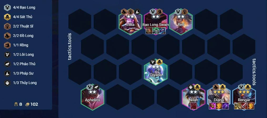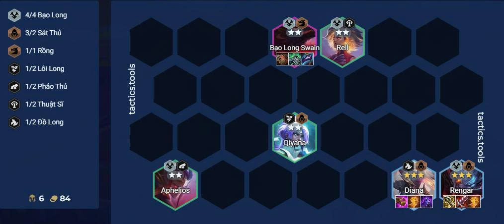 - Các tướng chính gồm Rengar (chủ lực chính), Bạo Long Swain (tank phép diện rộng), Diana và Nilah (carry phụ).