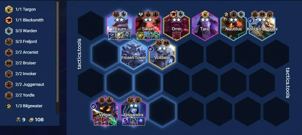 Đội hình hoàn chỉnh bao gồm: Veigar, Braum, Lissandra, Volibear, Swain, Taric, Nautilus, Kobuko, Ornn.