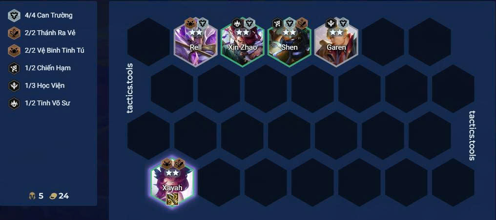 Đội hình xoay quanh Yasuo – chủ lực solo carry với lượng sát thương cao, kết hợp cùng dàn chắn Can Trường có khả năng chống chịu hàng đầu, tạo nên lối chơi vừa mạnh mẽ vừa bền bỉ trên bàn cờ.