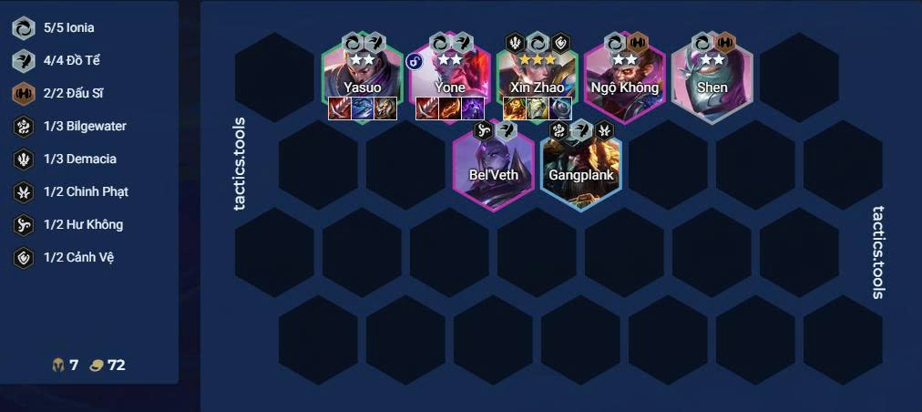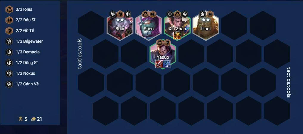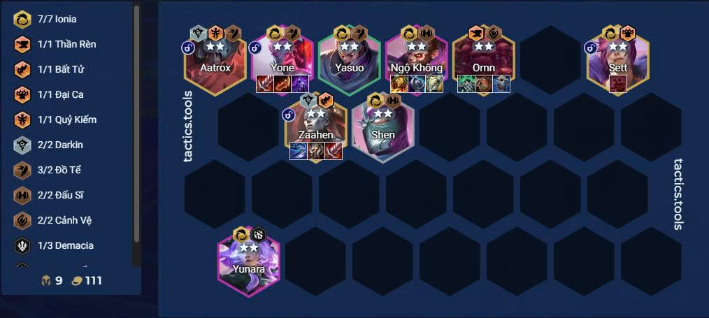 - 7 Ionia / 4 Đồ Tể / 2 Darkin / 2 Đấu Sĩ – vừa công mạnh, vừa trâu dàn trước.