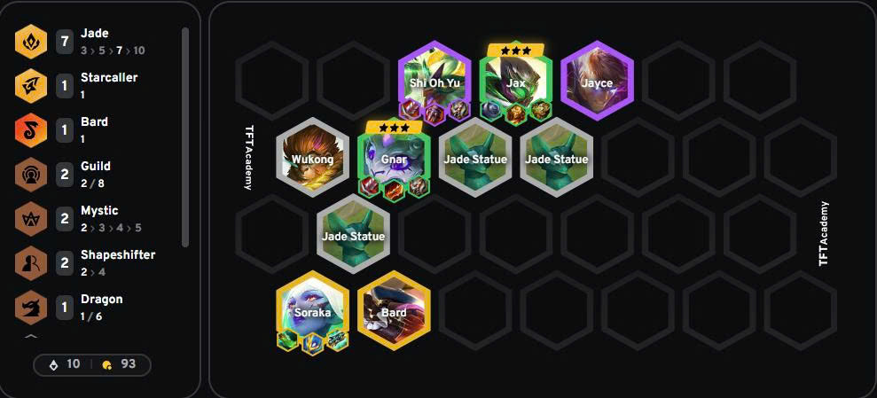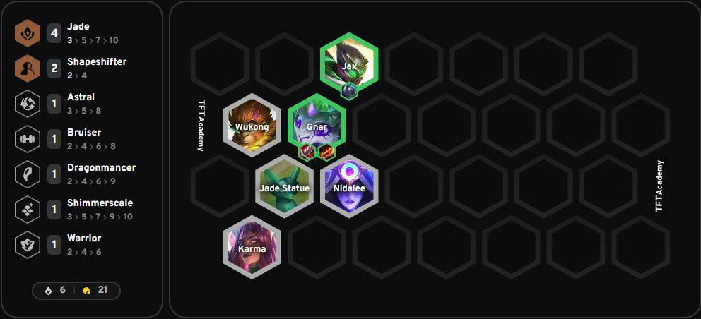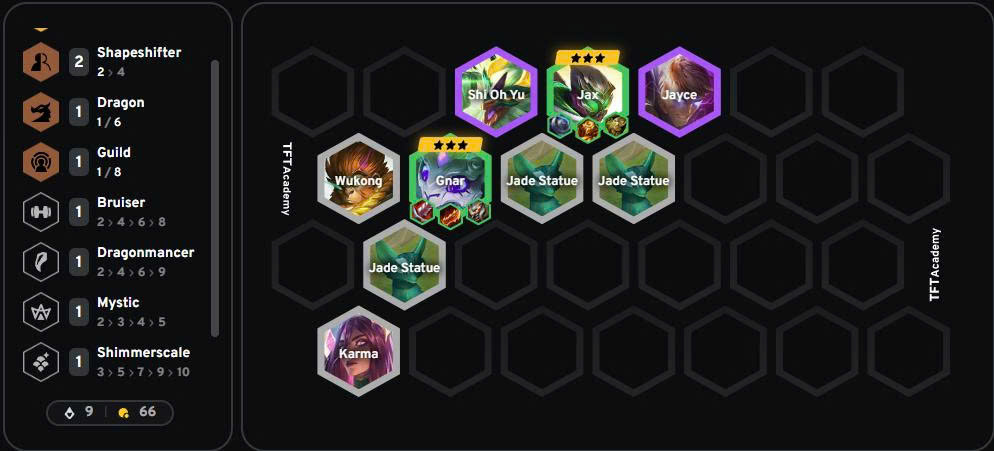 - Khi Gnar và Jax đã được 3 sao, hãy đẩy cấp để tìm thêm Long Thần Shi Oh Yu, bổ sung tuyến trước cực kỳ chắc chắn.