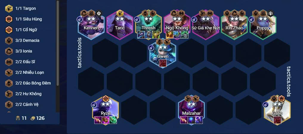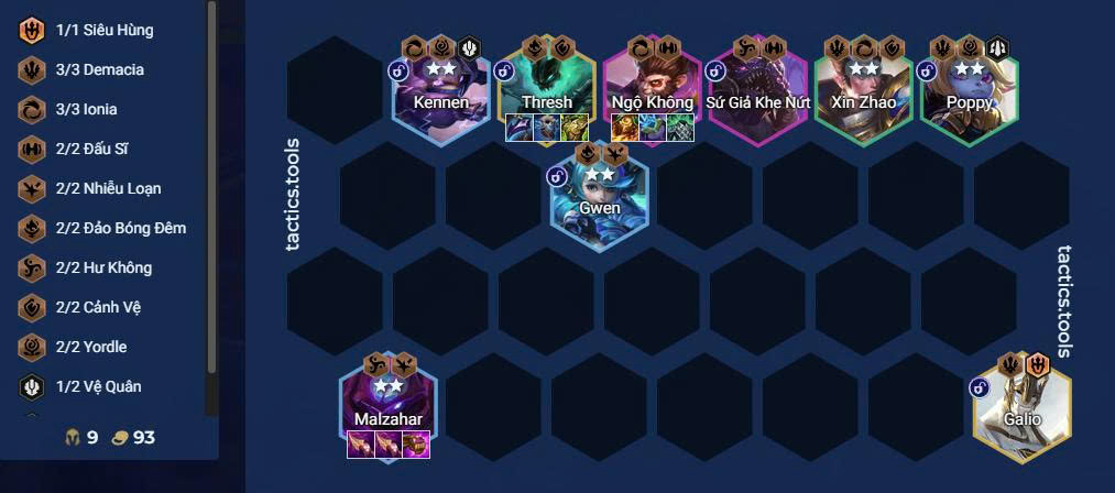 - Sau khi triệu hồi Galio, bán bớt các tướng Demacia, giữ lại Xin Zhao, Poppy và Galio.