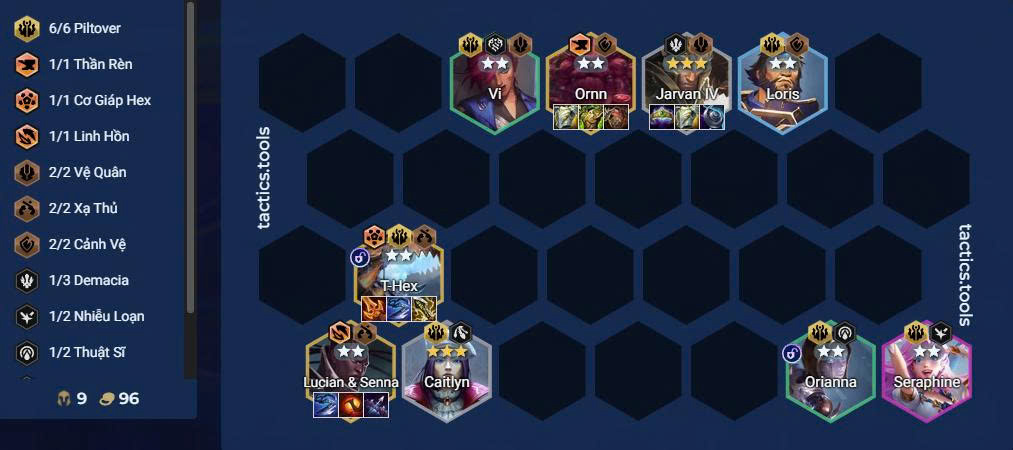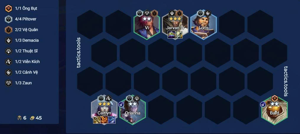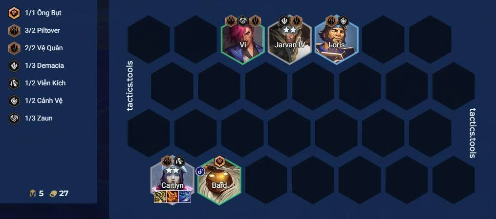 Slow roll Loris / Vi / Bard lên 2 sao và Jarvan IV, Caitlyn lên 3 sao phụ trợ sát thương và chống chịu. Khi có T-Hex chuyển đồ của Caitlyn sang cho T-Hex.