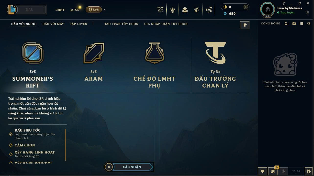 - Chọn ARAM hoặc Arena: Thời gian tìm trận nhanh (1–5 phút), game diễn ra nhanh hơn Summoner’s Rift, rất phù hợp phong cách “vào 1 trận nhận RP rồi thoát ra”.