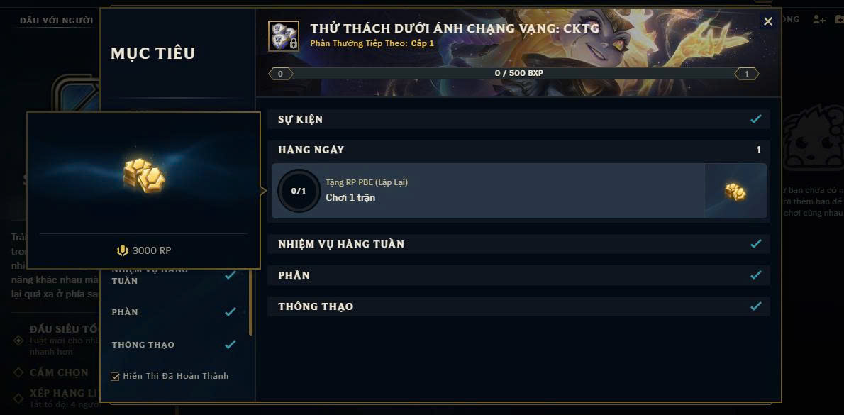 Khi đăng nhập PBE, trong tab Nhiệm vụ bạn sẽ thấy một nhiệm vụ đặc biệt mang tên “PBE Daily Mission”, yêu cầu chơi một trận ở chế độ ghép trận bất kỳ. Hoàn thành nhiệm vụ này, bạn sẽ nhận khoảng 3.000 RP, với thời gian hồi lại nhiệm vụ khoảng 20–24 giờ (không cố định theo lịch reset 0h).