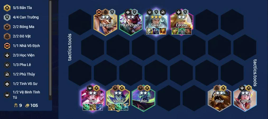 Đây là đội hình tối ưu để khai thác triệt để sức mạnh của Jinx về giai đoạn cuối trận. Jinx được đặt làm trung tâm, kết hợp cùng các tướng Bắn Tỉa và Can Trường như Varus, Caitlyn, Jhin, Gnar để gia tăng sát thương và tầm đánh.