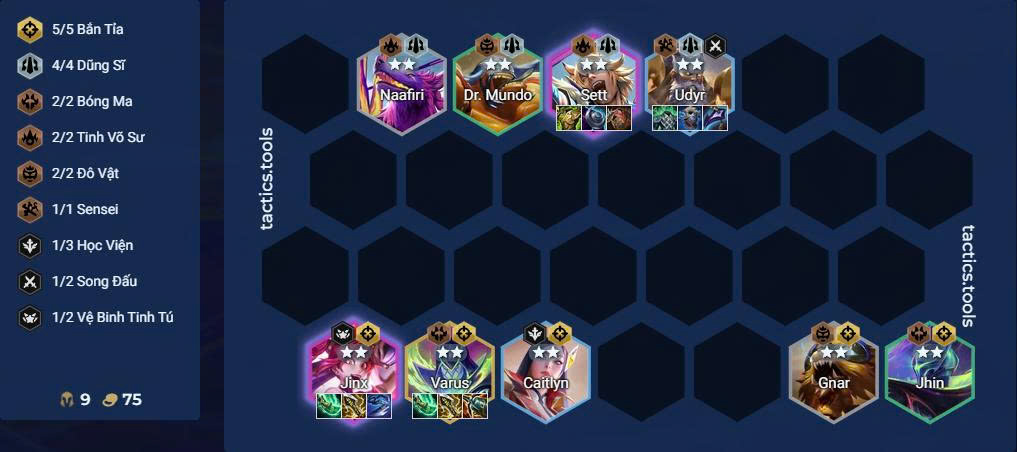 Đây là đội hình lý tưởng với ai muốn vừa chống chịu mạnh, vừa xả sát thương từ xa. Tuyến đầu là các Hạng Nặng, Dũng Sĩ vững chắc cung cấp lớp giáp dày, trong khi Jinx + Varus liên tục gây sát thương diện rộng.