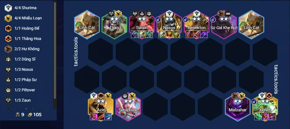 - Đội hình mẫu: Azir, Xerath, Nasus, Renekton (4 Shurima kim cương) + Swain, Sứ Giả Khe Nứt tăng chống chịu, thêm Seraphine và Malzahar, Ekko kích hoạt tộc/hệ Nhiễu Loạn tăng sát thương.