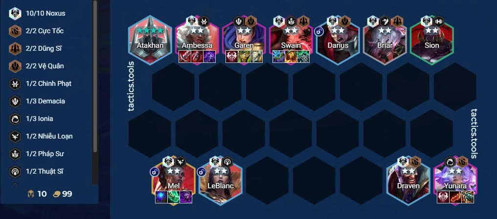 - Đội hình mẫu: Mel, Leblanc, Draven, Ambessa, Swain, Darius, Briar, Sion. Ấn Noxus có thể bỏ vào các tướng bất cứ để kích hoạt thêm các hệ/tộc tăng chỉ số sức mạnh.