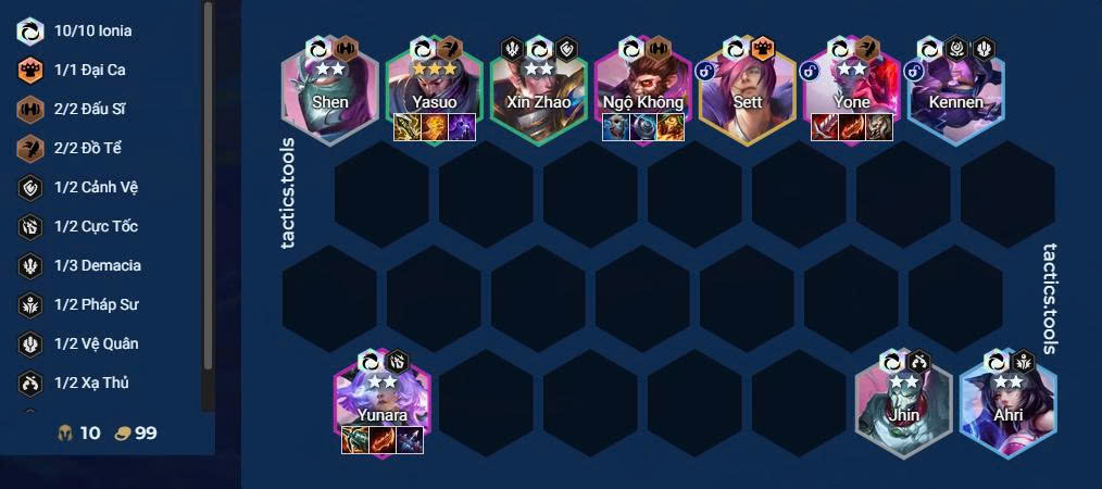 - Đội hình mẫu: Yasuo (carry), Yunara, Jhin, Ahri, Shen, Xin Zhao, Ngộ Không, Yone, Kennen, Sett.