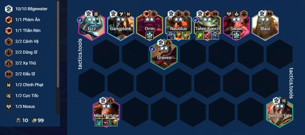- Đội hình mẫu: Gangplank, Miss Fortune, Illaoi, Twisted Fate, Fizz, Graves, Nautilus, Tahm Kench, Ornn, Swain.
