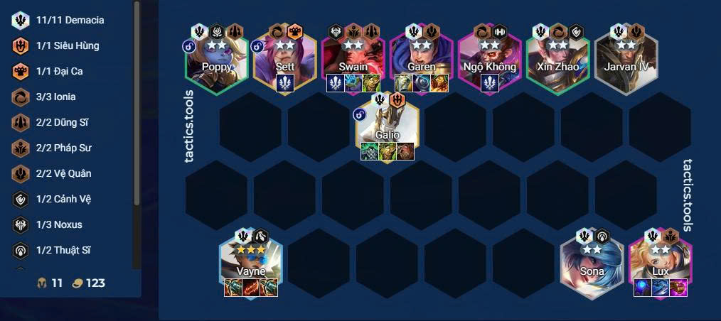 - Đội hình mẫu: Garen, Vayne, Lux, Sona, Poppy, Xin Zhao, Jarvan IV và Swain, Ngộ Không, Sett mang ấn Demacia.