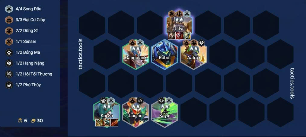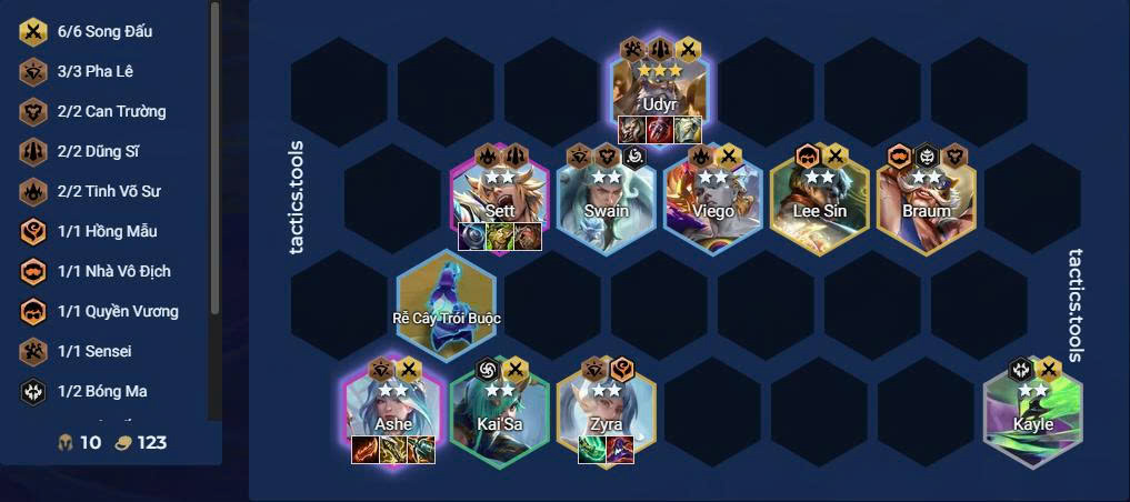 - Ở cấp 6 (vòng 3), bắt đầu xoay đội hình về Song Đấu, ưu tiên nâng cấp Udyr sớm nhất có thể.