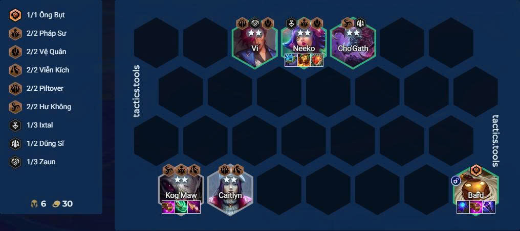 Chơi đội hình Pháp Sư & Vệ Quân để giữ máu và chuyển tiếp đội hình ở giai đoạn kế. Các tướng bao gồm: Kog'Maw, Caitlyn, Vi, Neeko, Cho'Gath & Bard.