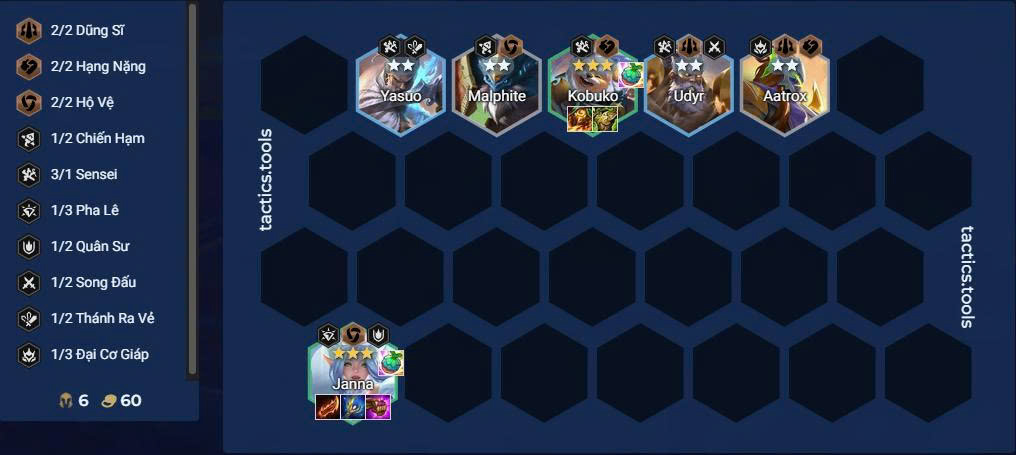 - Cấp 6: Sử dụng khung 4 Sensei (Janna + Kobuko + Yasuo + Udyr). Đây là lúc dừng để roll.
