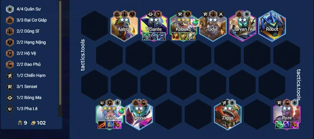- Cấp 7: Thêm Ziggs (Quân Sư) để buff toàn đội.