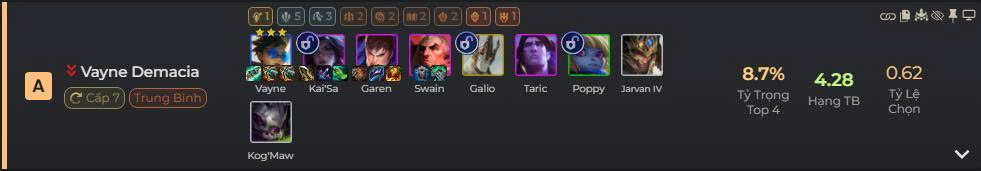 Kết quả, đội hình Vayne - Demacia gần như “lao dốc”, với thứ hạng trung bình rơi xuống khoảng 8.7 - cho thấy mức độ hiệu quả suy giảm rõ rệt. Hầu hết các trụ cột trong đội hình này đều không còn giữ được sức ảnh hưởng như trước.