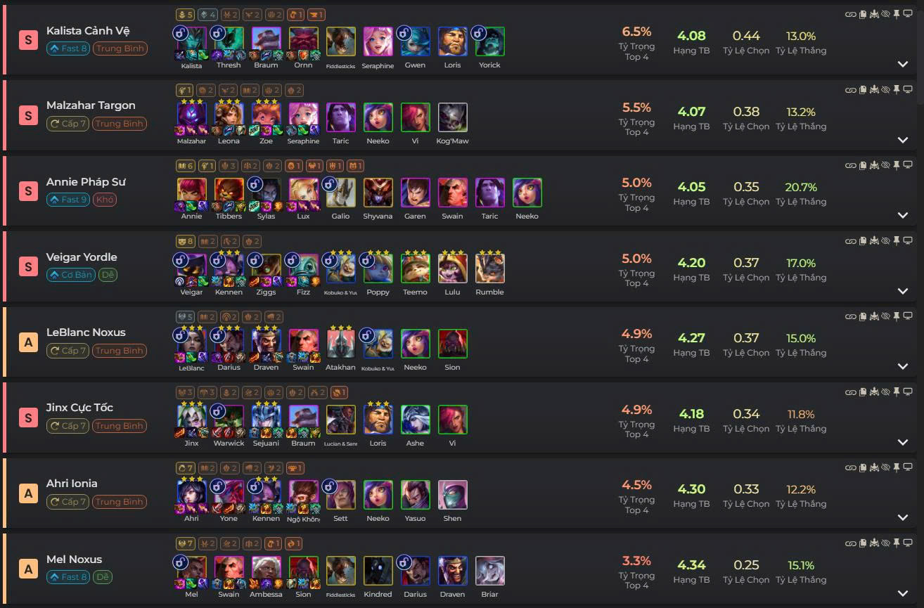 Trong khi đó, các đội hình đang nổi như Annie Pháp Sư, Noxus hay Malzahar gần như không bị ảnh hưởng, tiếp tục là những lựa chọn ổn định cho người chơi muốn leo rank.