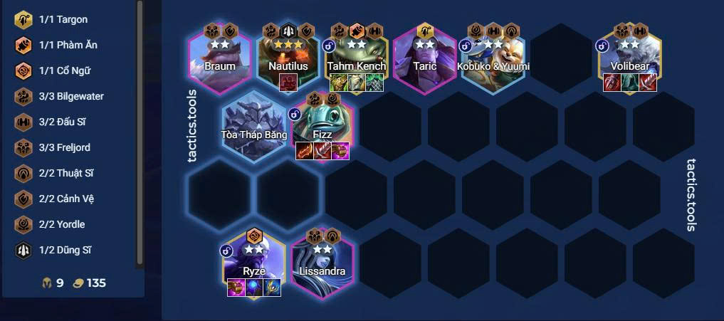 Khung đội hình hoàn chỉnh cấp 9 gồm: Illaoi - Kobuko - Fizz - Braum - Taric - Lissandra - Ryze - Volibear - Tahm Kench.