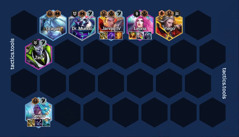 - Giai đoạn 3: Reroll ở cấp 7 để tìm các tướng Jarvan IV, Senna, và Gragas. Ưu tiên nâng cấp Jarvan IV và Senna vì đây là hai tướng chủ lực sát thương.