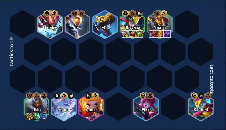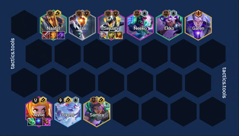 Naafiri khi chơi ở hệ tộc Quân Sư sẽ gặp một số khó khăn giai đoạn giữa trận ở cấp 6-7. Nếu may mắn, bạn sẽ có các tướng như Sejuani và Neeko, giúp đội hình trở nên hoàn thiện hơn.