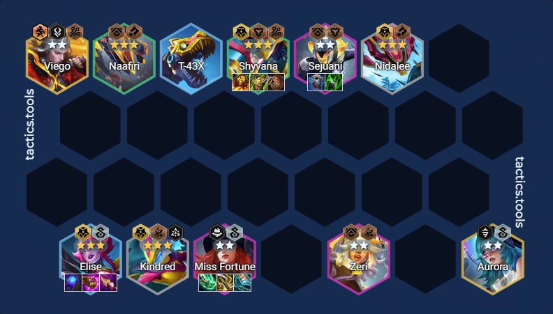 - Đội hình level 10 tròn bộ bài sẽ bao gồm: Nidalee, Kindred, Naafiri, Shyvana, Zeri, Elise, Miss Fortune, Sejuani, Aurora và Viego.