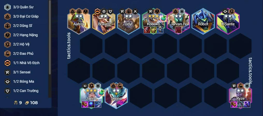 - Lối chơi: Slowroll cấp 6 khi đã có Janna Thức Tỉnh Cựu Binh (Yasuo tạm thời), sau đó lên 8 bổ sung Quân Sư + K’Sante.