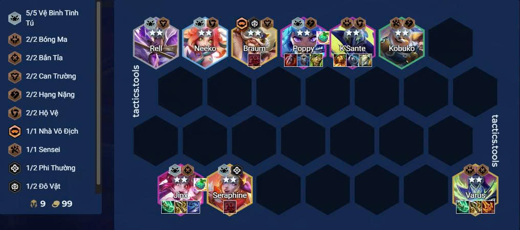 Mặc dù bị ảnh hưởng gián tiếp từ giảm sức mạnh hiệu ứng Vệ Binh Tinh Tú, Jinx vẫn là carry đáng tin cậy nhờ Thức Tỉnh riêng “Tập hợp năng lượng” cực khủng khiếp. Hiện tại, đội hình tối ưu sẽ thêm K’Sante/Kobuko giữ tank, Varus và Seraphine gây thêm sát thương cuối game.