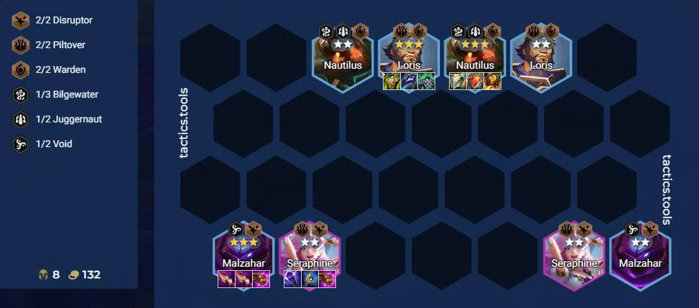 Đội hình: Malzahar + Nautilus reroll 3 sao, tuyến giữa có Seraphine hỗ trợ late.