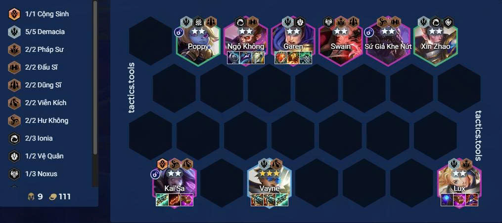 Đội hình hoàn chỉnh gồm form bài tiêu chuẩn xoay quanh Demacia kết hợp Hư Không, với hai đầu tàu chủ lực là Kai’Sa và Vayne.