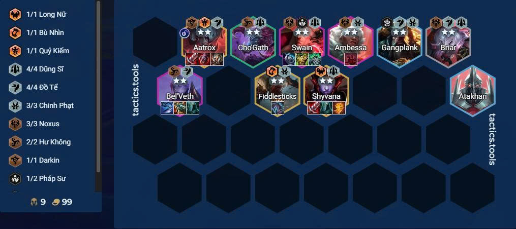 Khi đạt cấp 9, bạn có thể kẹp thêm một tướng Hư Không bất kỳ để kích hoạt mốc 2 Hư Không. Đây là một điểm cộng lớn ở patch 16.3b vì mốc 2 luôn cung cấp Đột Biến tấn công mạnh mẽ, giúp đội hình tăng đáng kể lượng sát thương tổng thể.