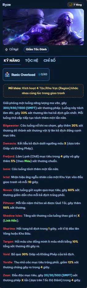 Ryze mang một kỹ năng đặc biệt: mỗi làn sóng cổ ngữ của hắn thay đổi theo vùng đất đang kích hoạt trong đội hình. Từ sát thương chuẩn của Freljord, khả năng hành quyết của Demacia, cho đến các hiệu ứng độc, hồi máu, hoặc gây vàng từ Shurima.