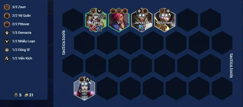 - Dàn khung cơ bản: 3 Zaun + kẹp 1–2 Piltover như Caitlyn, các tướng rẻ như Blitzcrank, Vi, Ekko, Mundo nếu ra sớm.