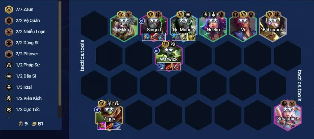 Đội hình chuẩn: Blitzcrank, Vi, Ekko, Mundo, Jinx/Warwick, Singed, Ziggs cùng một vài tướng kẹp hệ.