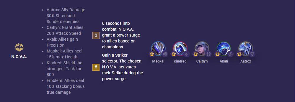 - 2 N.O.V.A: Trong 6 giây đầu giao tranh, toàn đội nhận hiệu ứng Đột Phá tương ứng với các tướng N.O.V.A đang sở hữu.