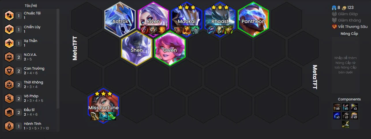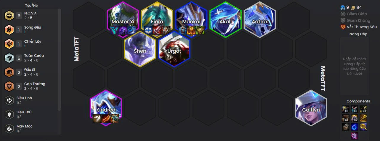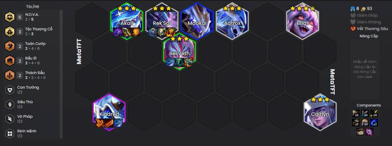 Ví dụ: Aatrox có khả năng giảm 30% Giáp và Kháng Phép của kẻ địch, giúp đội hình không cần phụ thuộc vào Liandry hay Morello, từ đó có thể tập trung tài nguyên cho chủ lực. Trong khi đó, Kindred (4 vàng) với hệ Song Đấu đóng vai trò chủ lực, kết hợp cùng các tướng chống chịu như Aatrox hoặc Maokai sẽ tạo nên một khung đội hình ổn định.