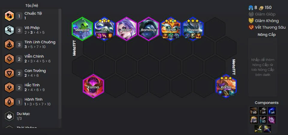 - Tướng hỗ trợ: Ornn, Rhaast, Karma, Rammus, Gwen, Meepsie, Riven.