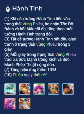 Tộc Hành Tinh xoay quanh trạng thái “Phiêu” - cơ chế giúp tướng tăng tốc đánh và hồi Máu Tối Đa, với sức mạnh gia tăng theo số lượng tướng Hành Tinh trong đội hình. Dưới đây là các mốc kích hoạt: