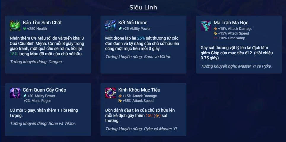 Dưới đây là các trang bị Siêu Linh nổi bật, mỗi món mang lại hiệu quả riêng tùy theo tướng chủ lực. Hãy lựa chọn phù hợp với đội hình để tối ưu sức mạnh.