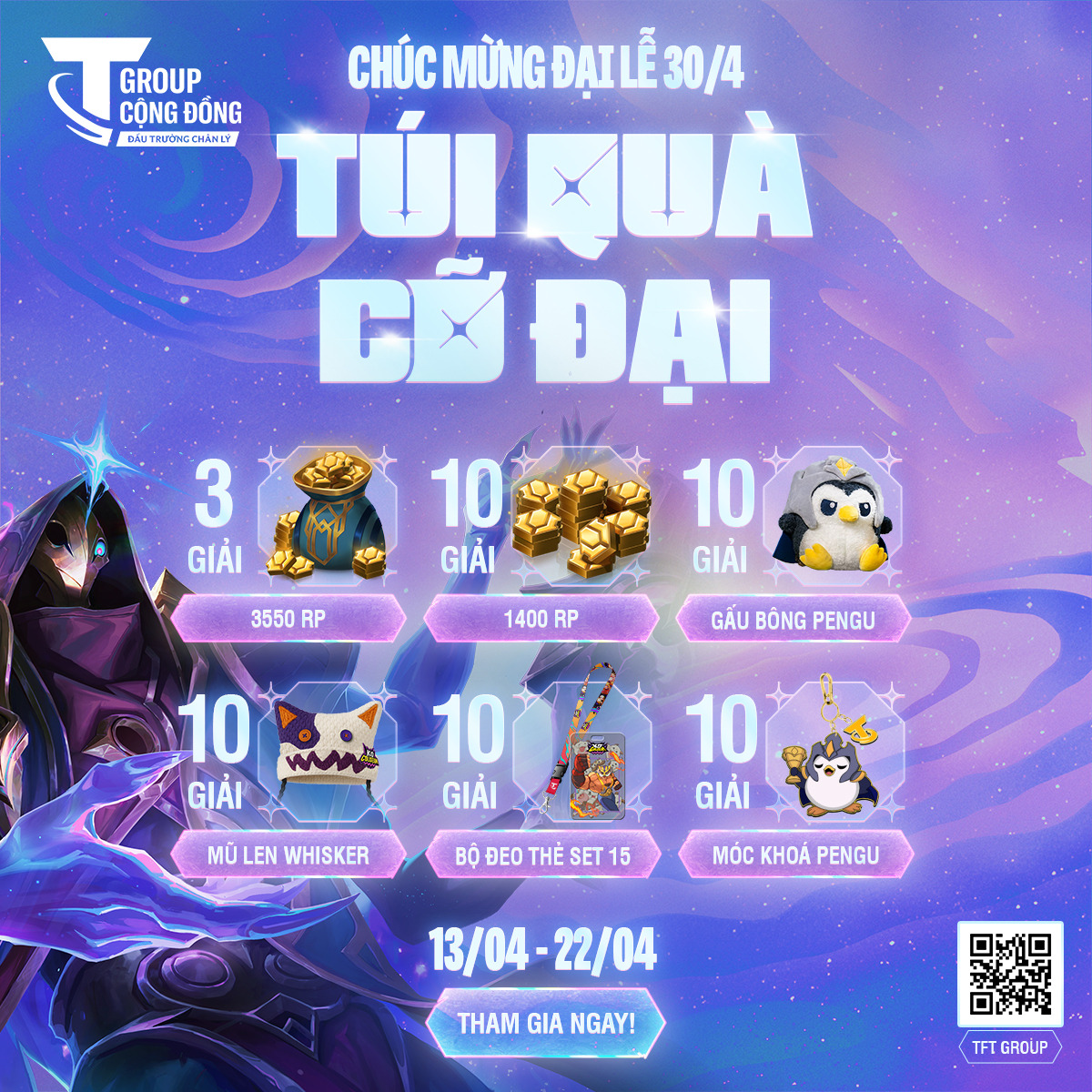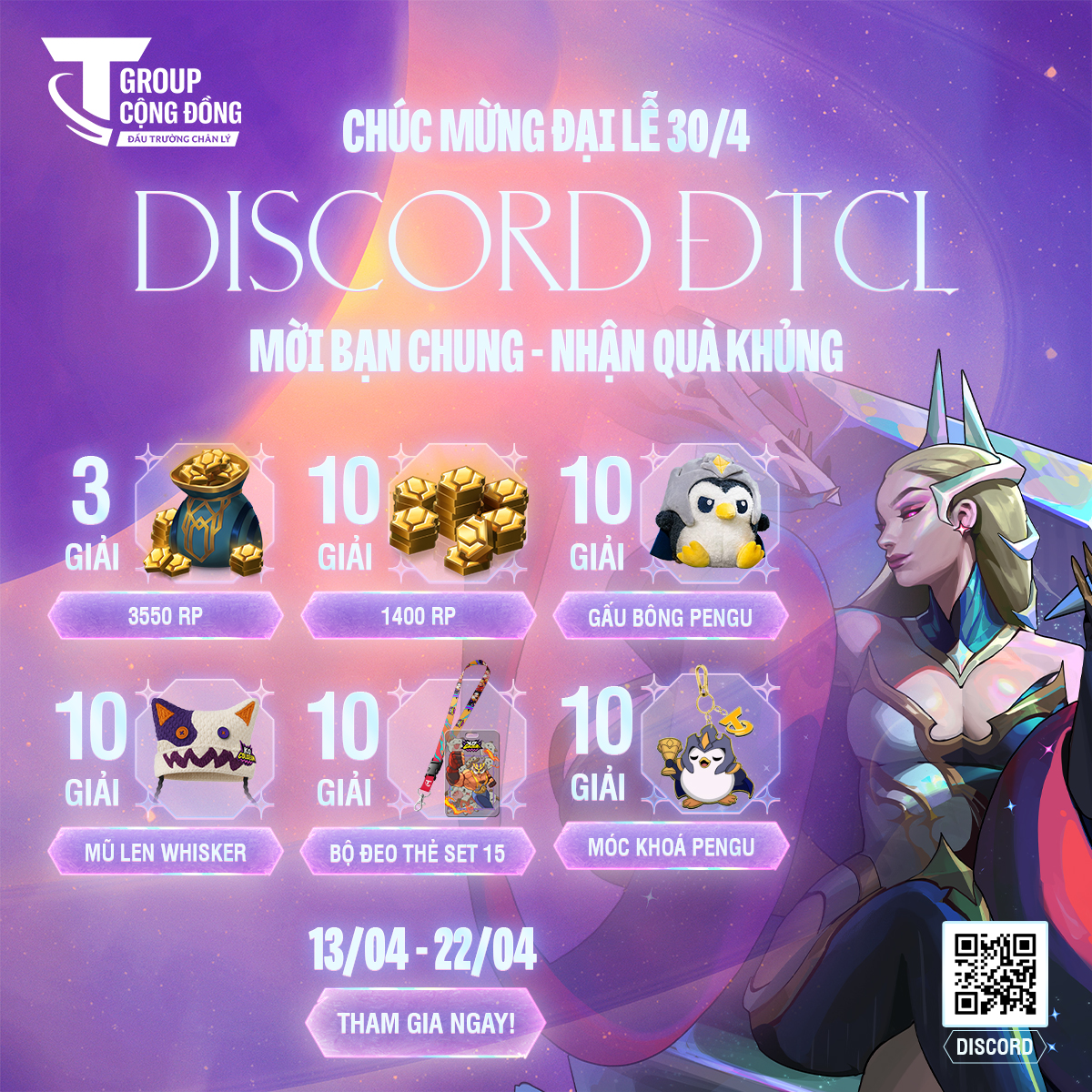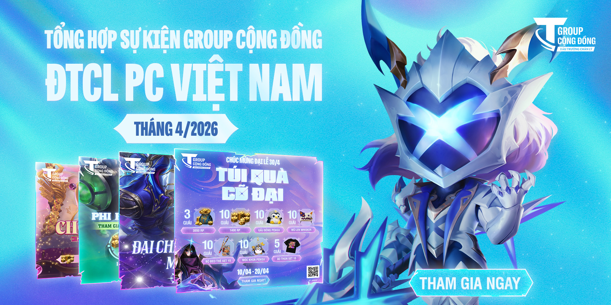 Chào các chiến binh Đấu Trường Chân Lý! Tháng 4 này, cộng đồng TFT Việt Nam sẽ “nóng” hơn bao giờ hết với loạt sự kiện đa dạng: từ give away chúc mừng đại lễ 30/04, túi quà cỡ đại tại group và discord, giải đấu chiến trường không gian đầy kịch tính.