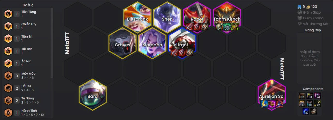 Đội hình xoay quanh 3 tướng chủ lực gồm: Urgot (3 vàng - Đấu Sĩ/Toán Cướp), Mighty Mech (4 vàng - Viễn Chinh) và Aurelion Sol (4 vàng - Tụ Năng).