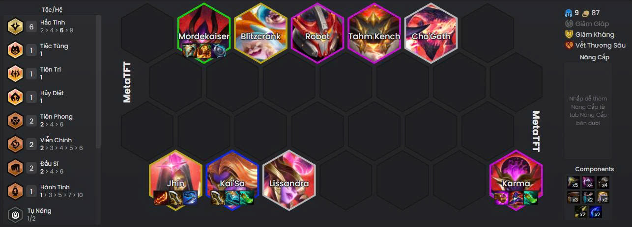 Đội hình gồm 6 tướng với sự cân bằng: Cho’Gath (1 vàng - Đấu Sĩ), Lissandra (1 vàng - Du Mục/Nhân Bản), Mordekaiser (2 vàng - Tụ Năng/Tiên Phong), Kai’Sa (3 vàng - Vô Pháp), Karma (4 vàng - Viễn Chinh) và Jhin (5 vàng - Hủy Diệt/Bắn Tỉa).