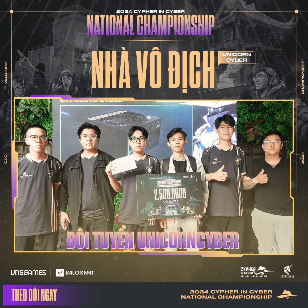 Sau một ngày thi đấu căng thẳng không kém kịch tính, cuối cùng chúng ta đã tìm ra Nhà Vô Địch nhận về giải thưởng tiền mặt và quà tặng độc nhất phiên bản giới hạn cùng 1 suất tham gia vòng Playoff 2024 CIC NATIONAL CHAMPIONSHIP là đội tuyển Unicorn Cyber.