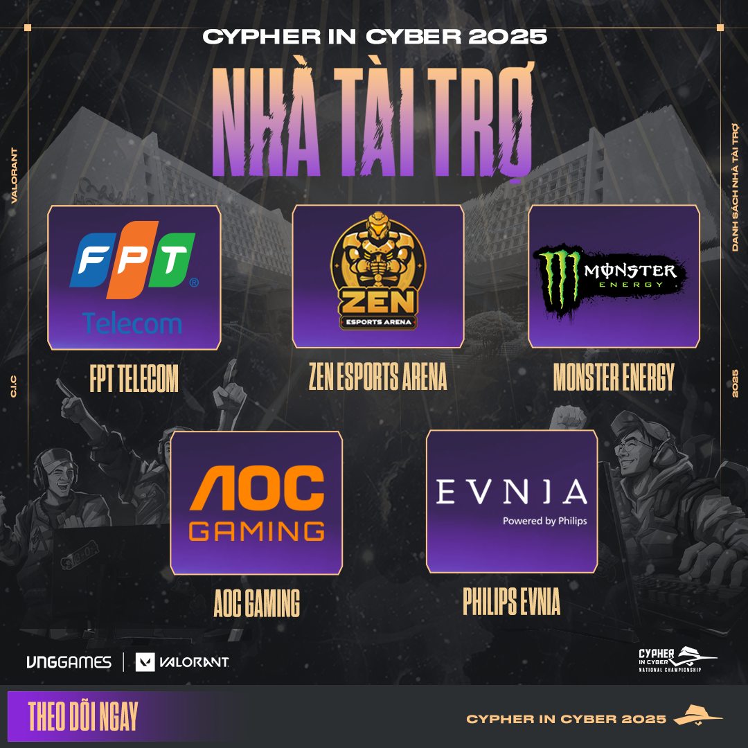 Cùng những nhà tài trợ FPT TELECOM, ZEN ESPORTS ARENA, MONSTER ENERGY, AOC GAMING & PHILIPS EVNIA và Báo Thanh Niên đồng hành cùng CYPHER IN CYBER 2025 hứa hẹn bùng nổ trong OFFLINE lần này với vô số các phần quà giá trị.